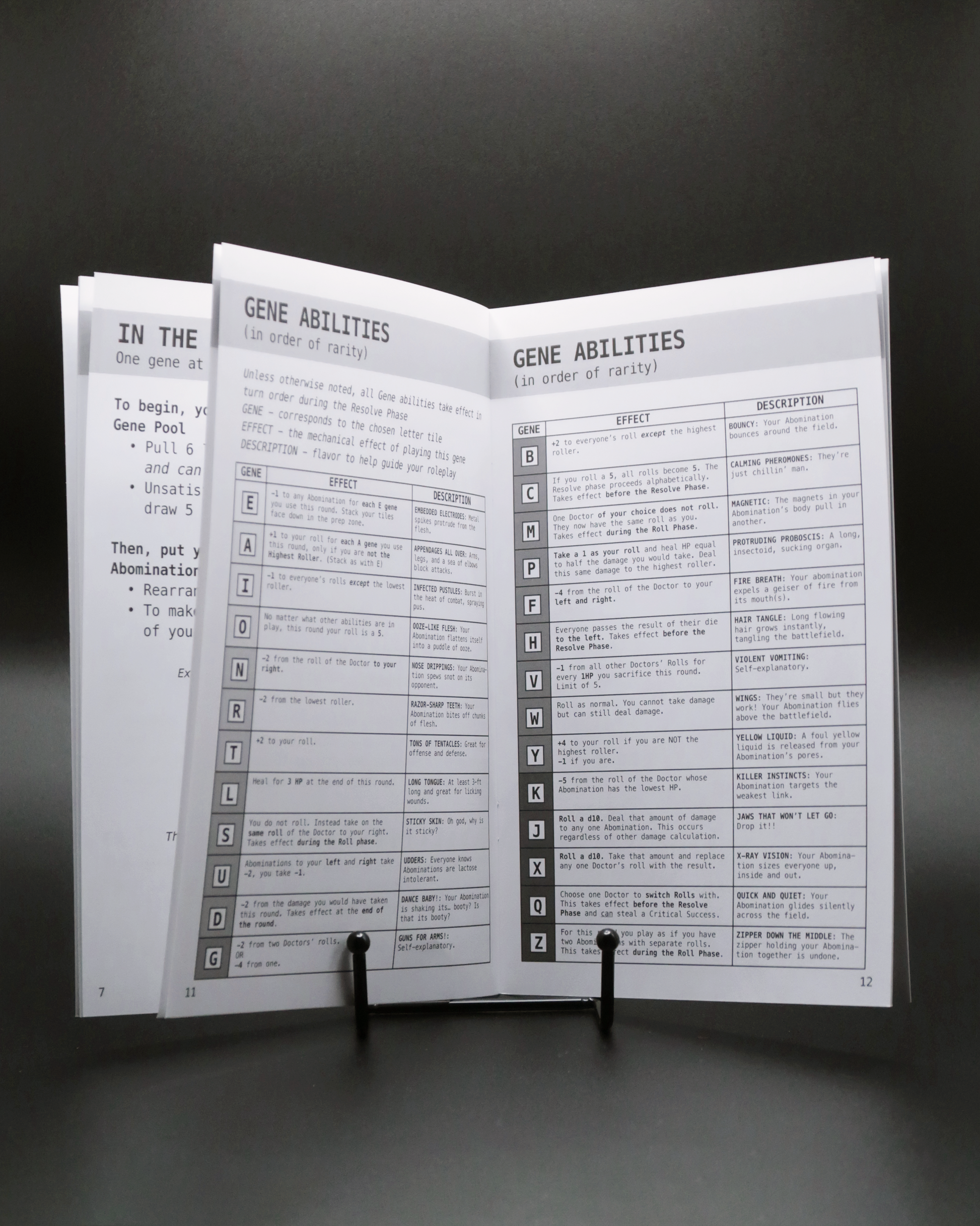 ABOMINATIONS is a tactile, GM-less TTRPG for 2-6 players. Using a set of letter tiles and some 10-sided dice, you will create one-of-a-kind monsters of your own design. Then take them into the ring for a fight to the last scraps.