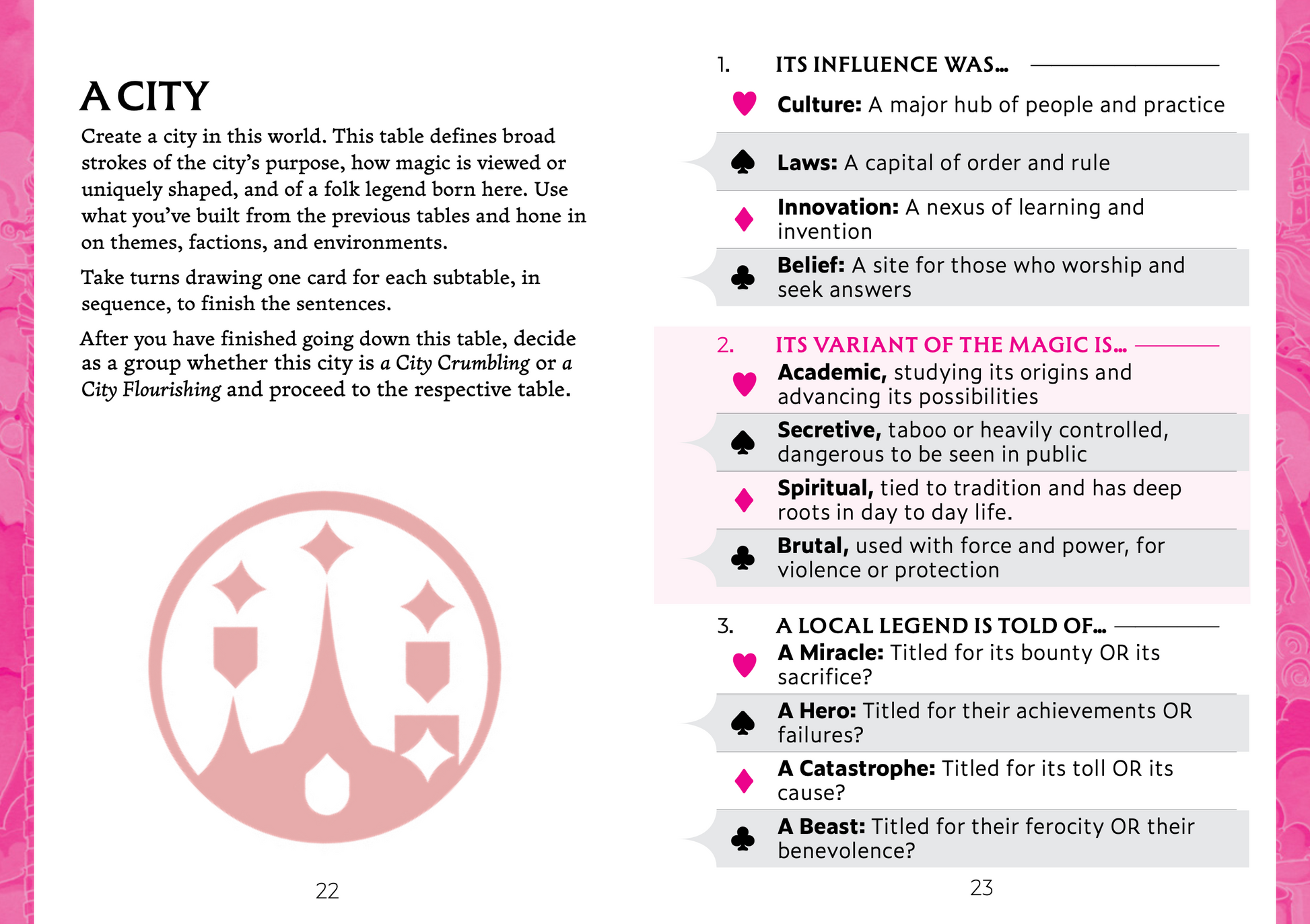 - Replayability - No two games will be alike. Players begin with establishing a palette and choosing touchstones for the world. From there, a variety of prompts and tables help bring their world to life. What do you get when you combine a world that is “stormy, gold, and jagged” with Legally Blonde and Hellboy as touchstones?